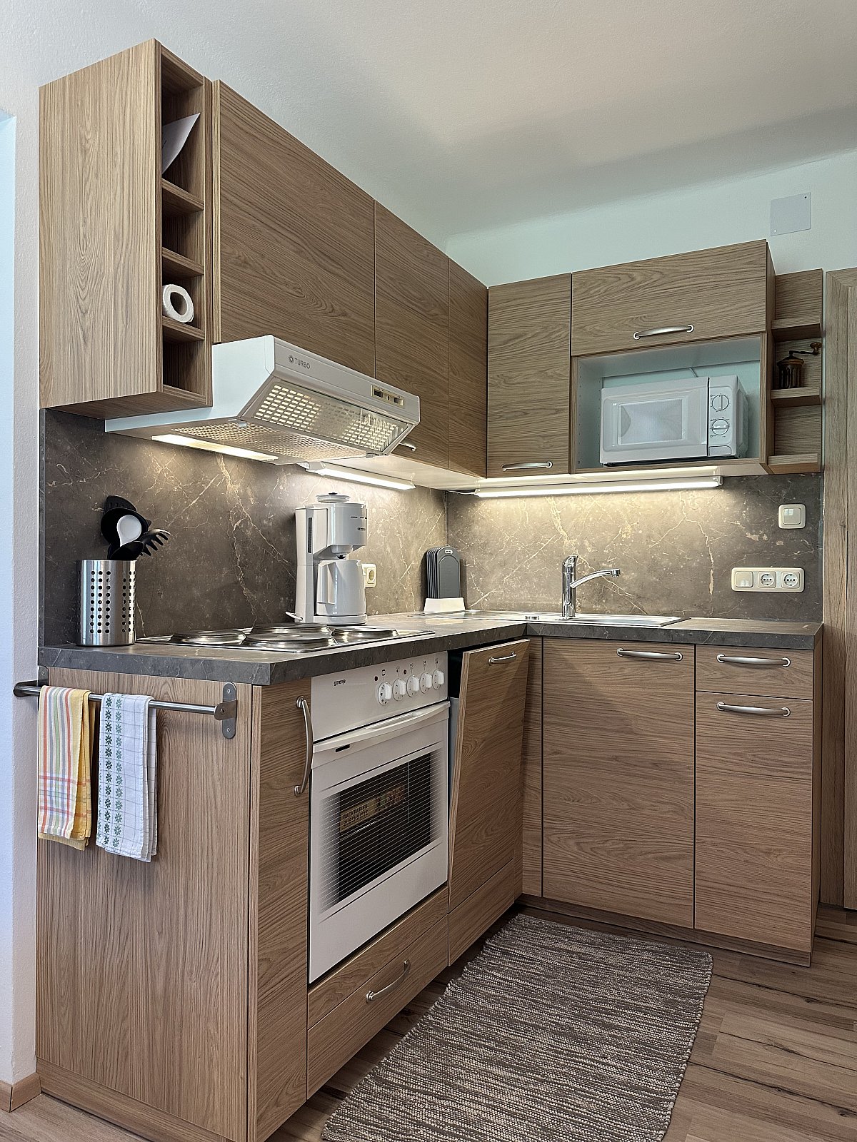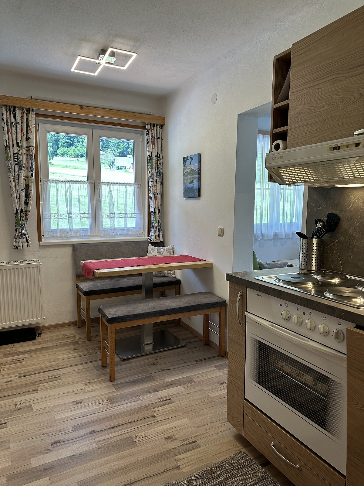- komplett ausgestattete Küchenzeile mit Geschirrspüler und Essecke